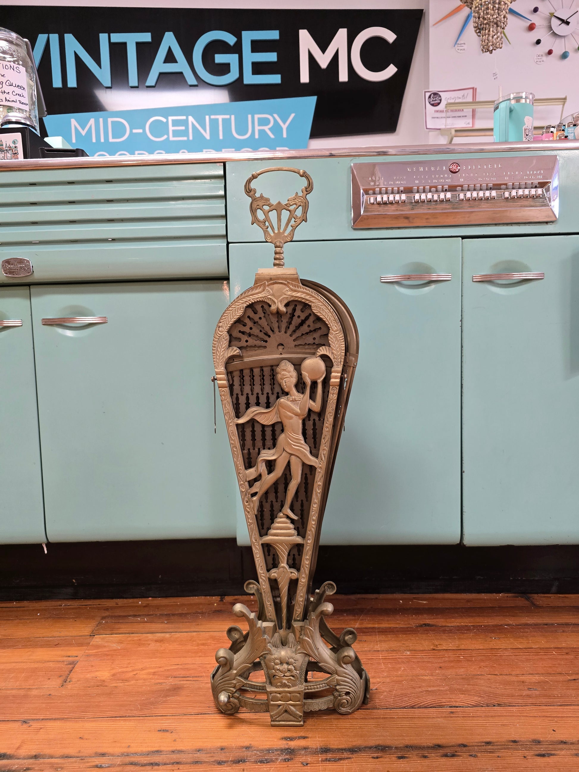This vintage fireplace screen is crafted from brass and features the foldable design these became so popular for.