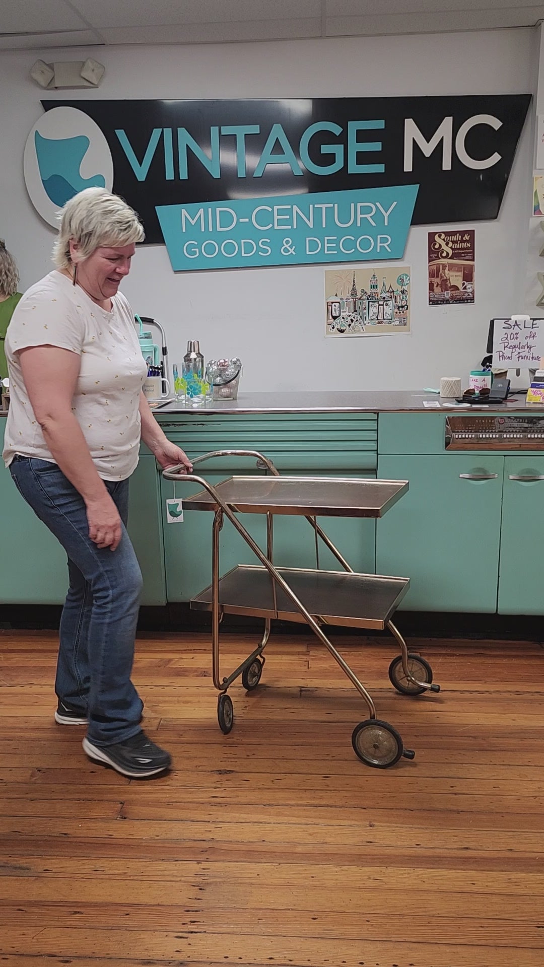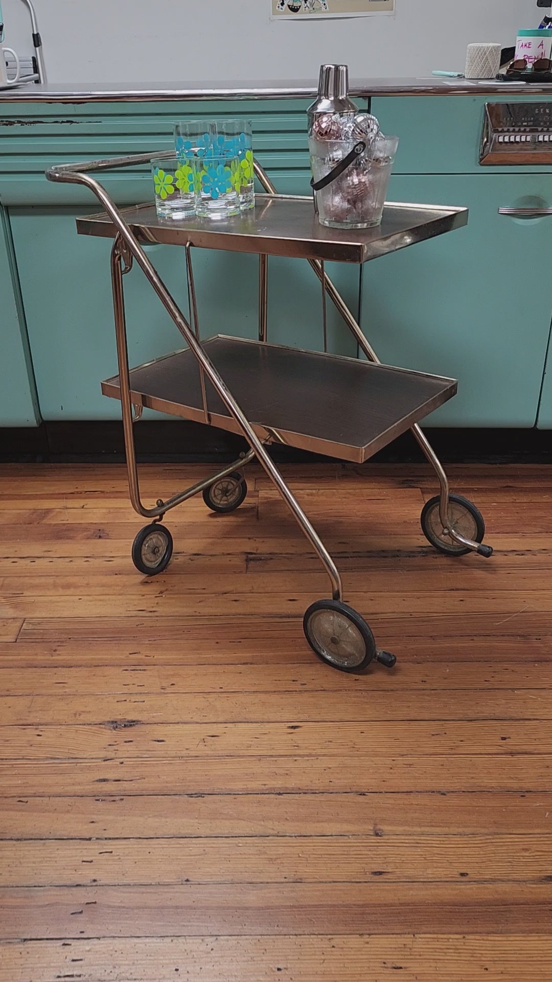 This unusual 1950s bar cart collapses for easy storage or moving. Two tiers give you lots of real estate for your glassware and check out the sparkly wheels!