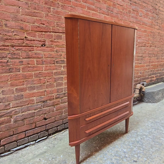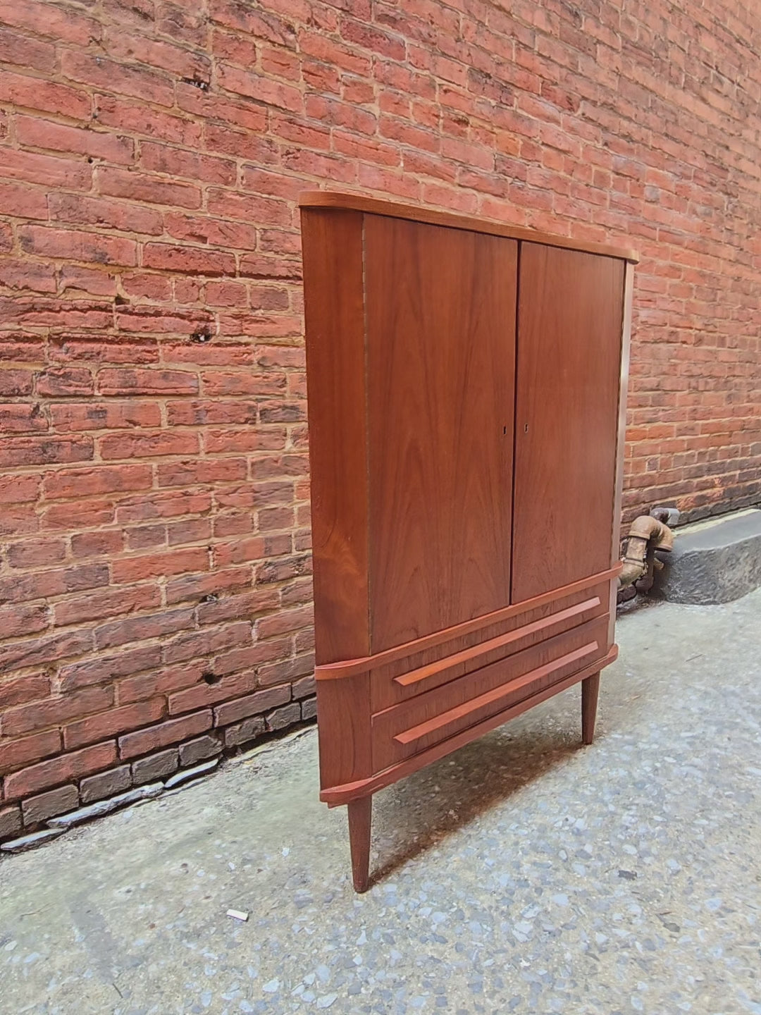 Bring sleek Scandinavian style to your entertaining space with this stunning vintage Danish teak corner cabinet. Designed with clean lines and rich teak grain, this mid-century piece makes the most of an unused corner while adding warmth and sophistication to your home.