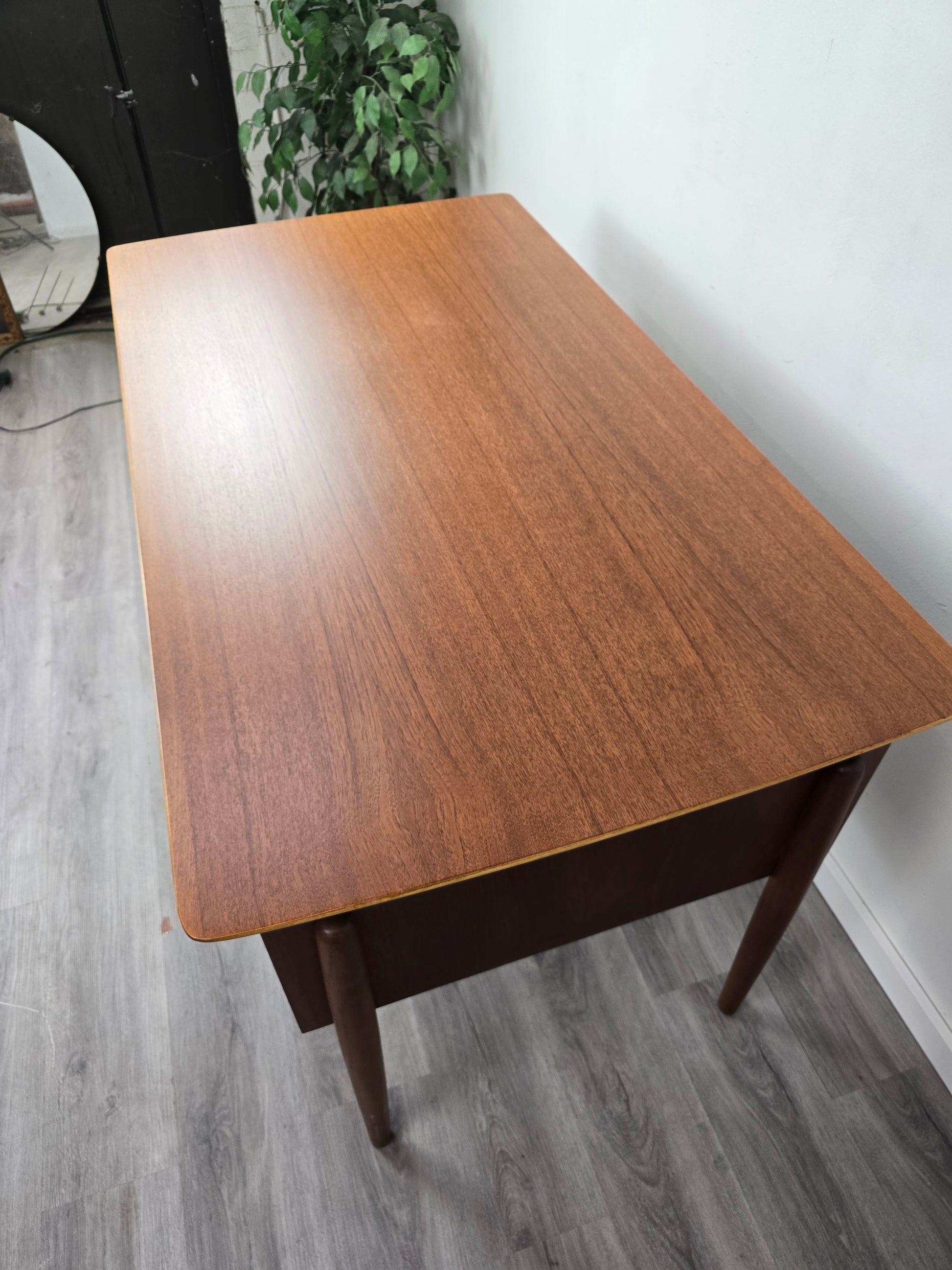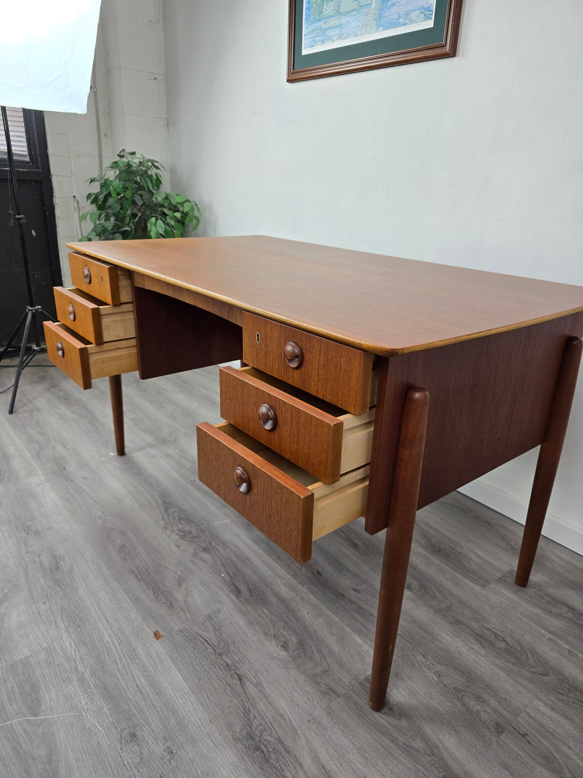 This Danish teak Desk is in the style of Kai Kristiansen. It has been professionally refinished.