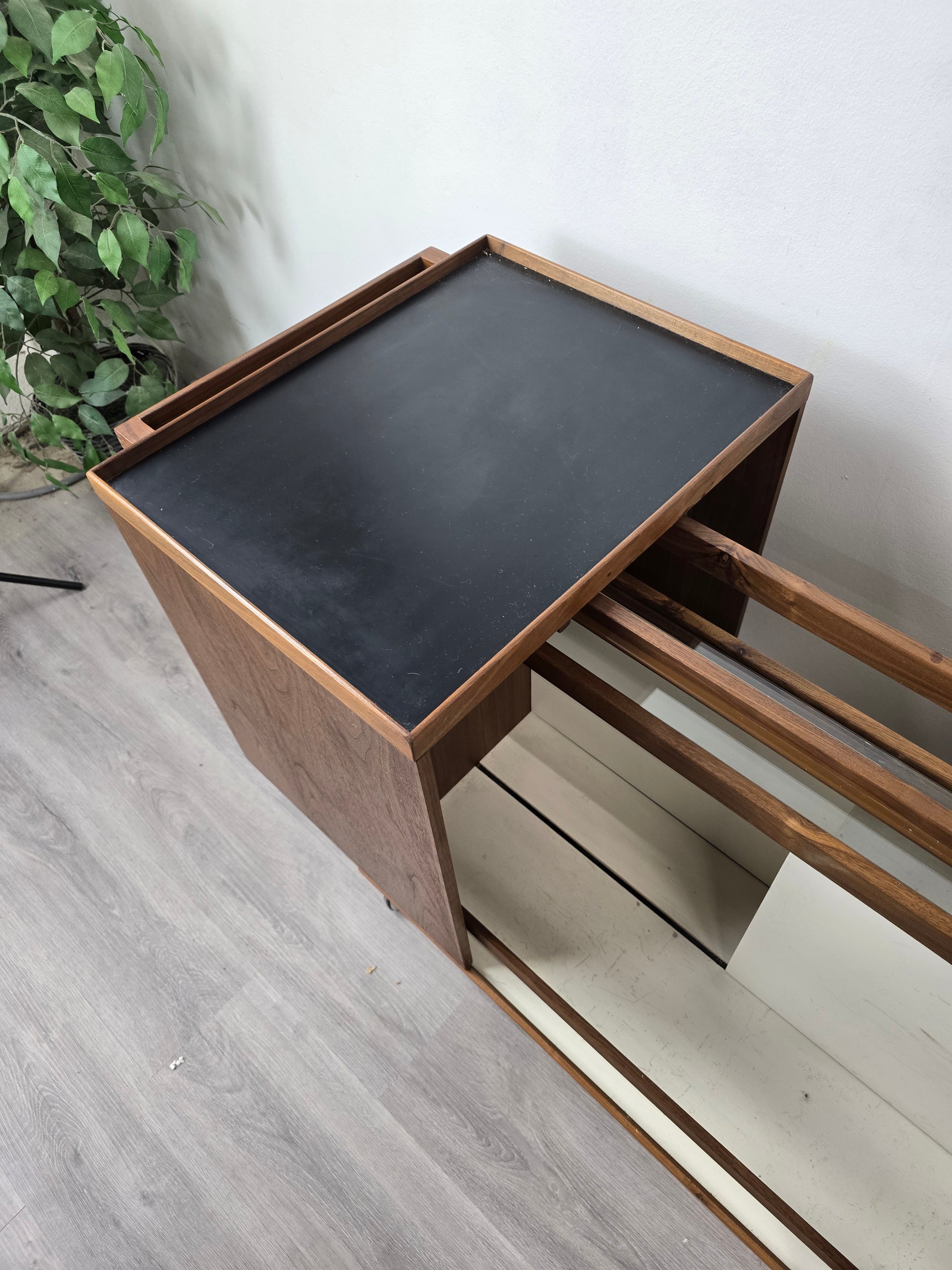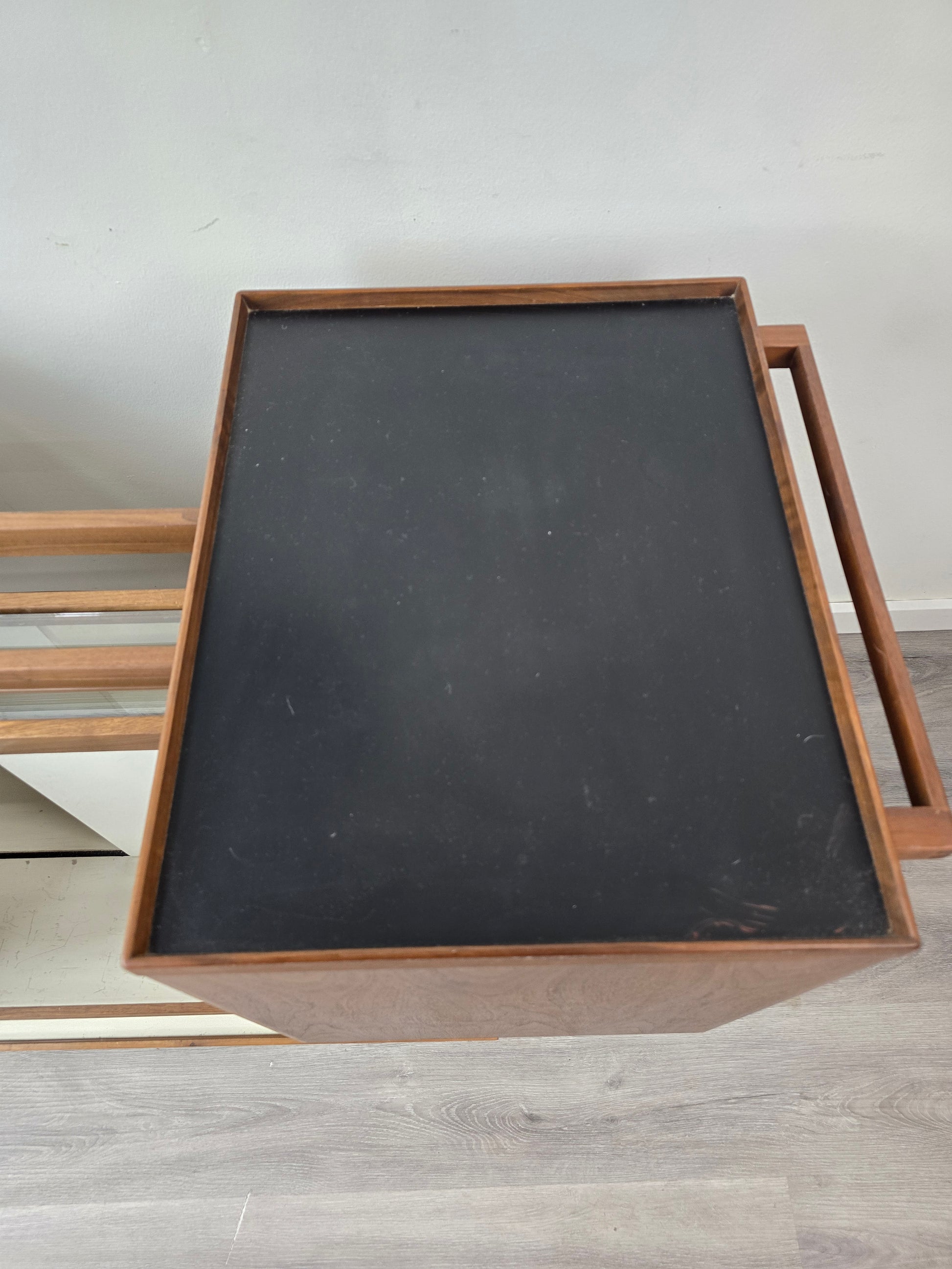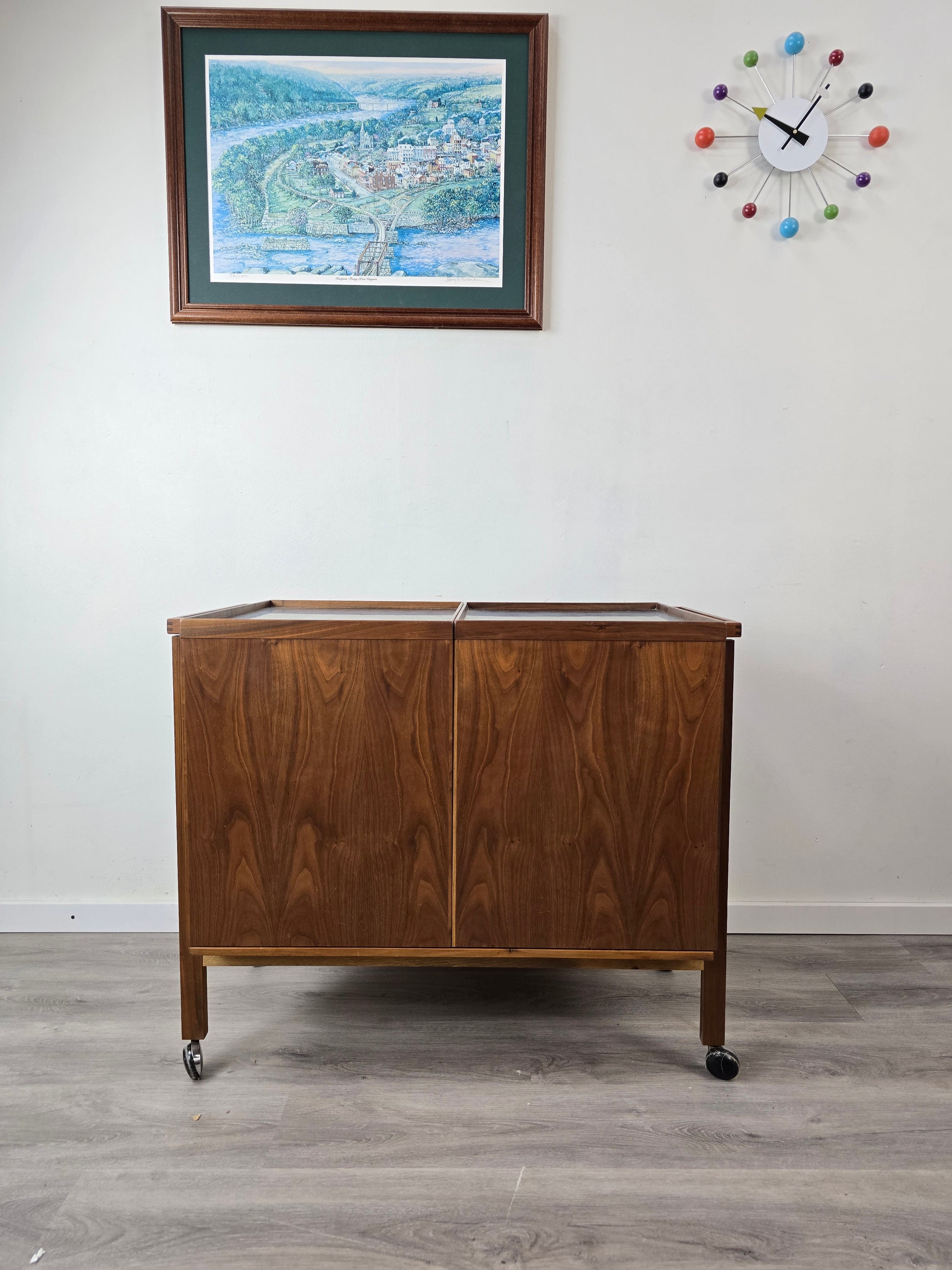 Raise a glass to beautiful Scandinavian design. This vintage rolling bar by Niels Erik Glasdam Jensen is a masterclass in functional elegance. Crafted in Denmark, it features striking book-matched walnut veneer with warm tones and rich grain variation throughout.