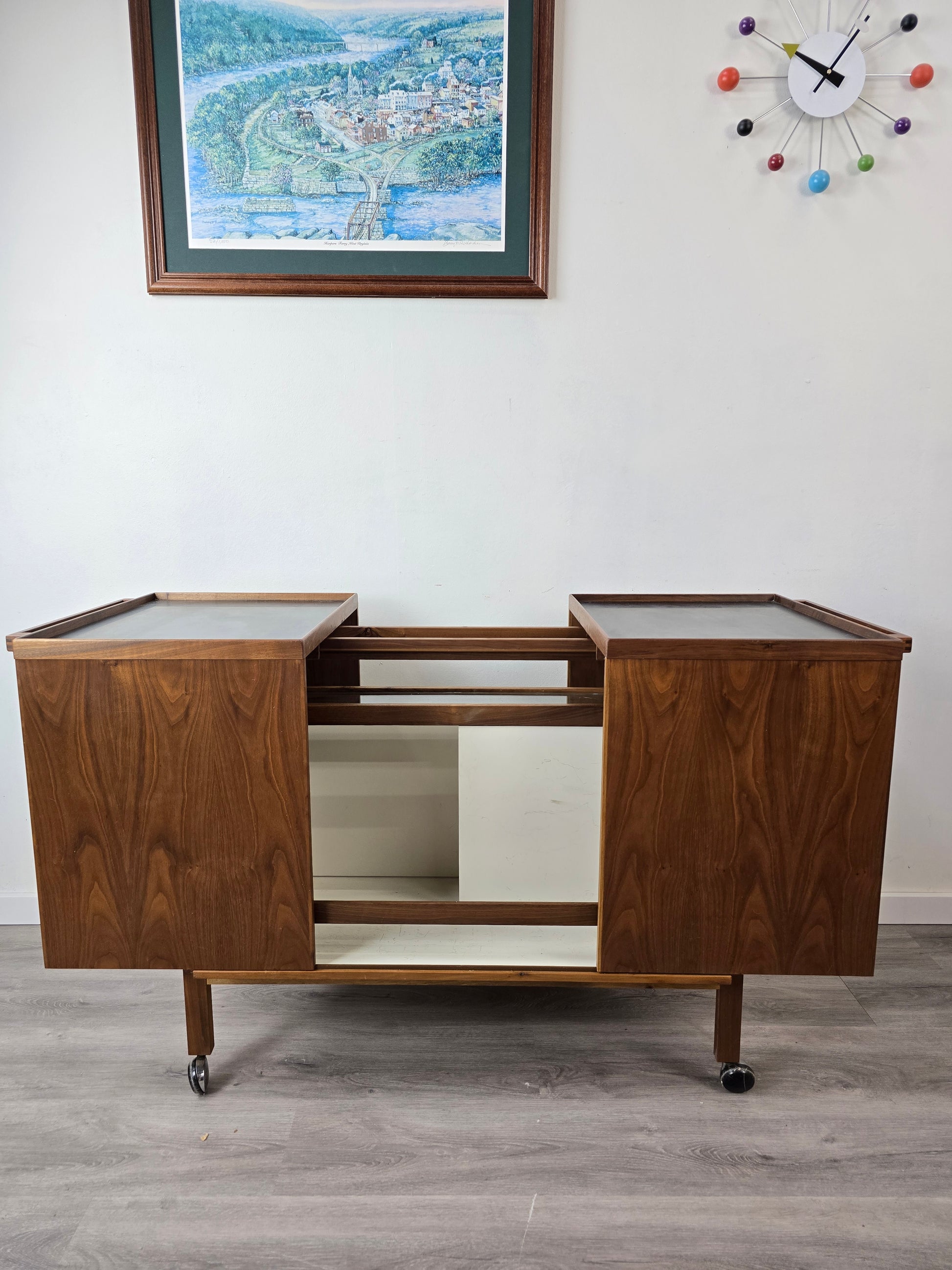 Finished on smooth-rolling casters, this bar travels wherever the celebration happens—living room, dining room, patio doors, you name it. The piece has been professionally refinished, preserving its timeless mid-century appeal while ensuring it’s ready for decades more enjoyment.