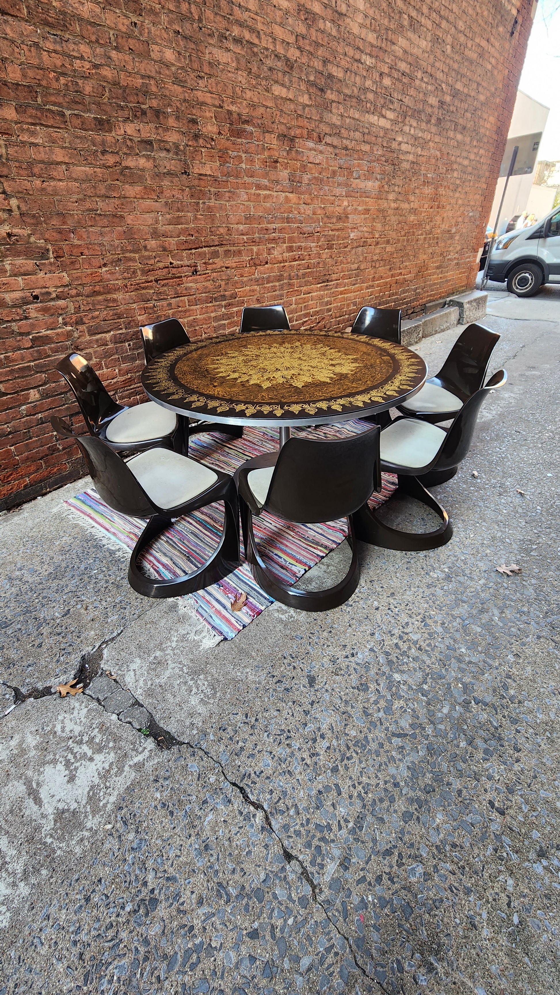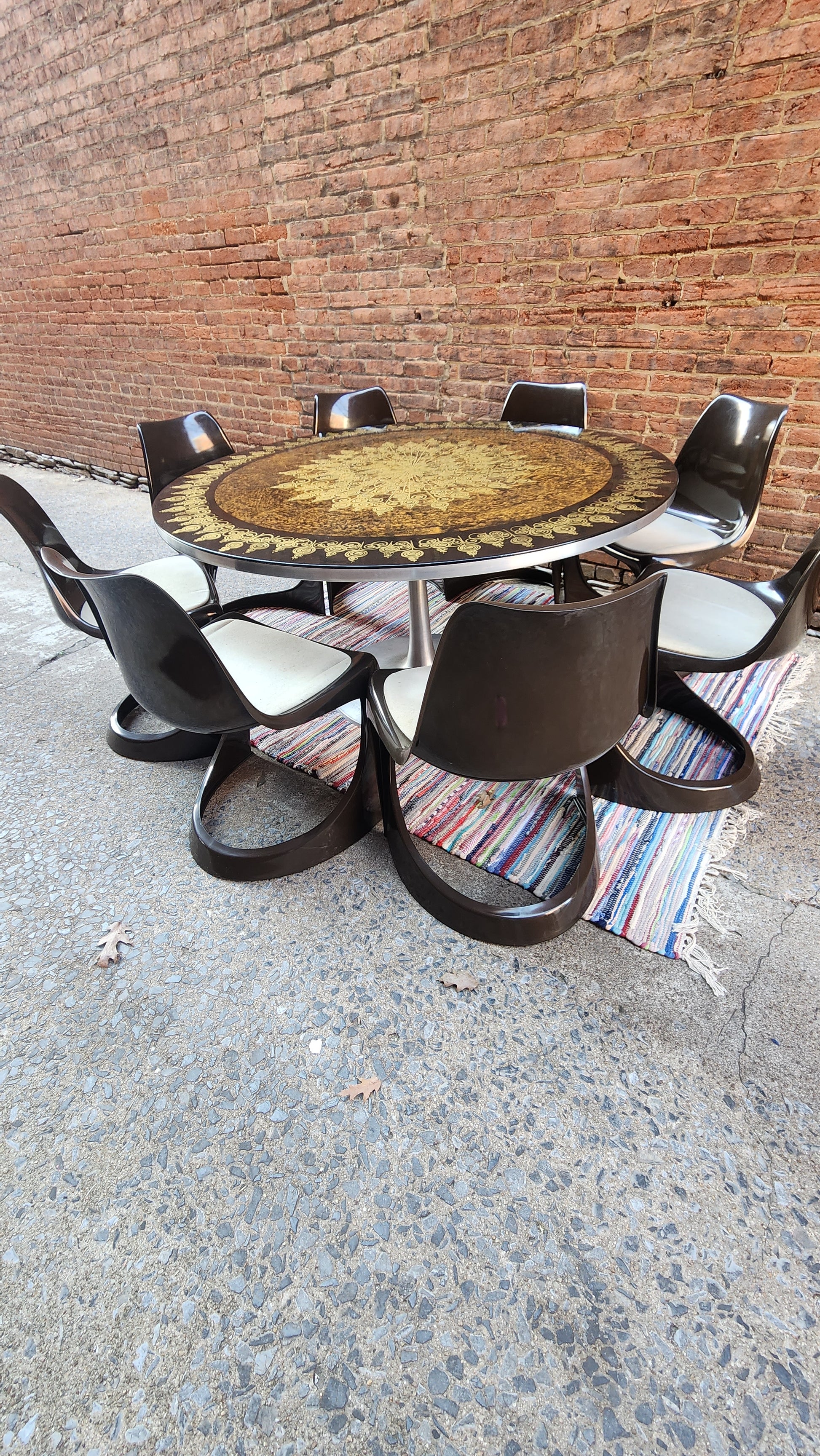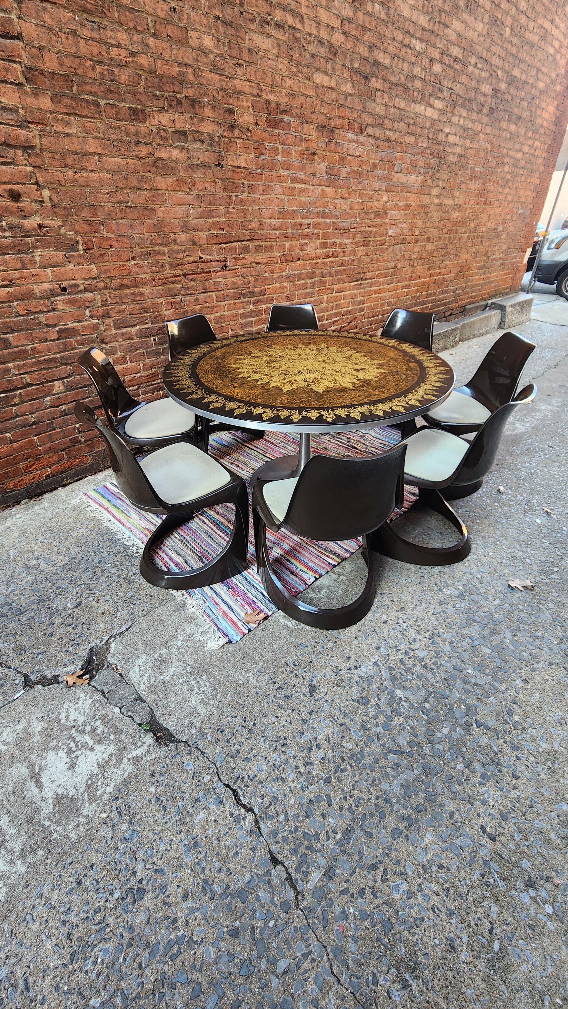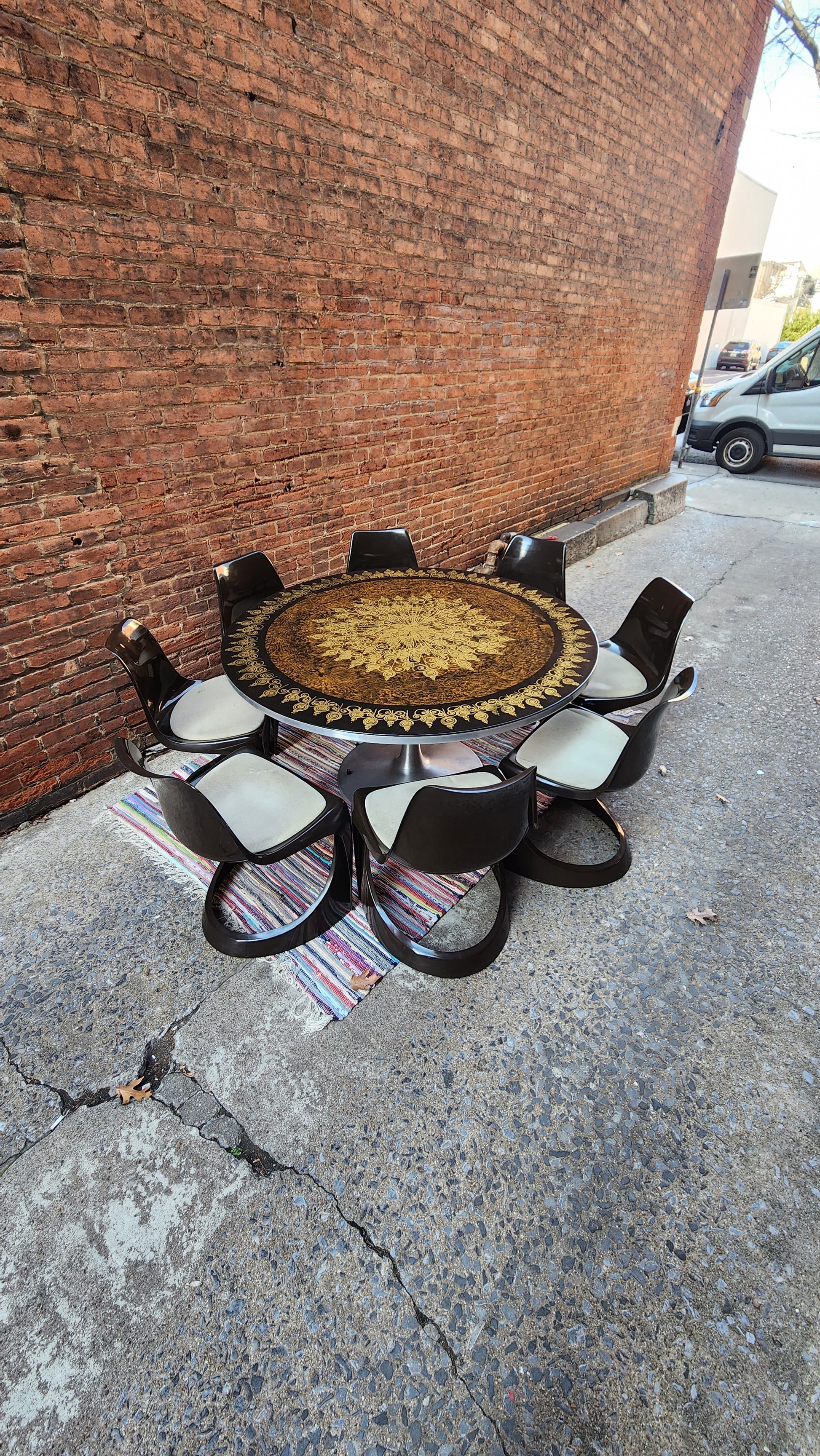 This incredible find includes a tulip base table and 8 chairs designed by iconic Danish designer, Poul Cadovius, creator of the original Cado wall unit. What makes this set even more amazing is it was purchased from the daughter of Cadovius and it was originally in his collection at his famed Cirkelhuset design center in Denmark.The table top art is by Susanne Fjeldsoe Myg, Danish artist and painter.