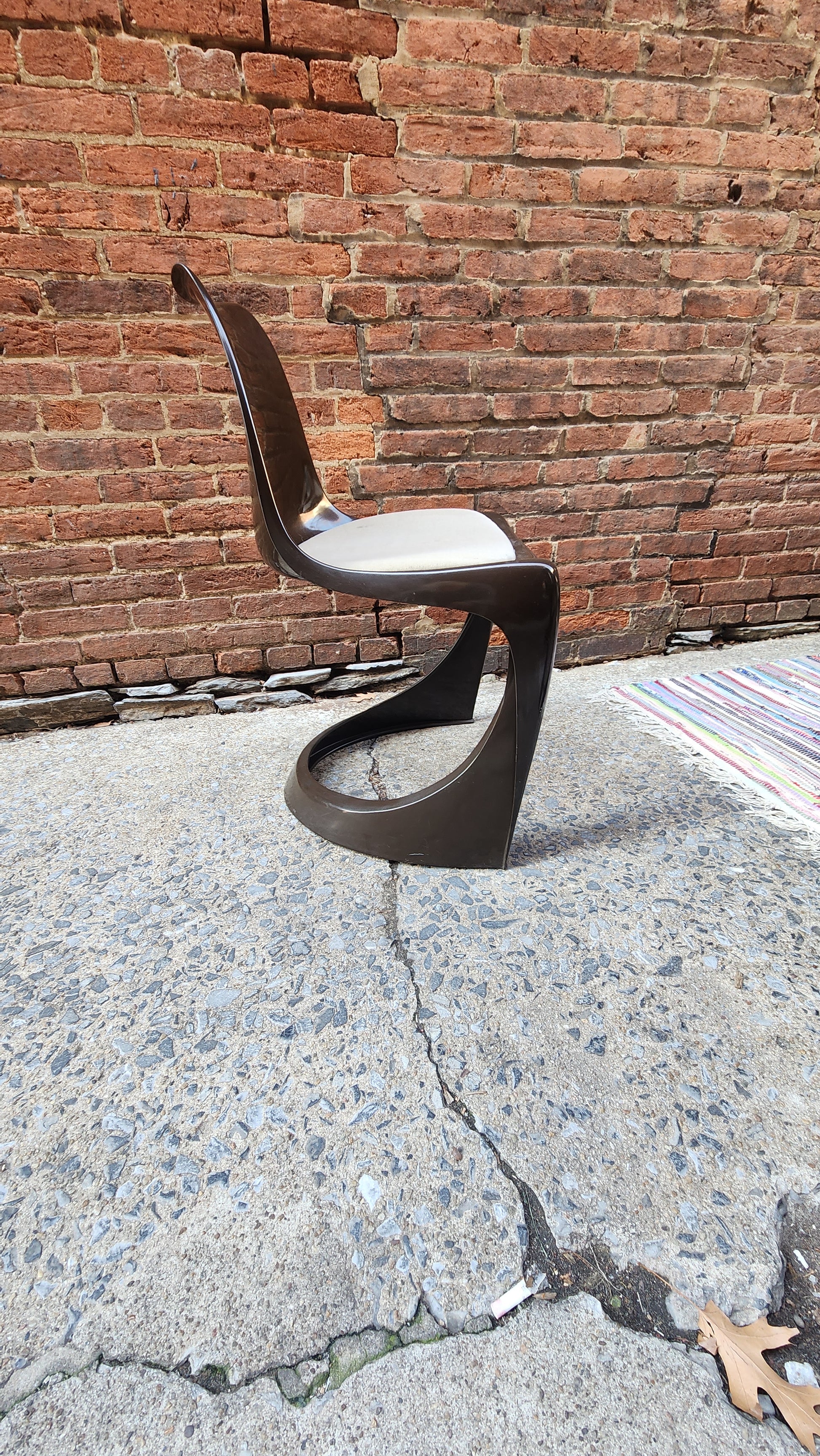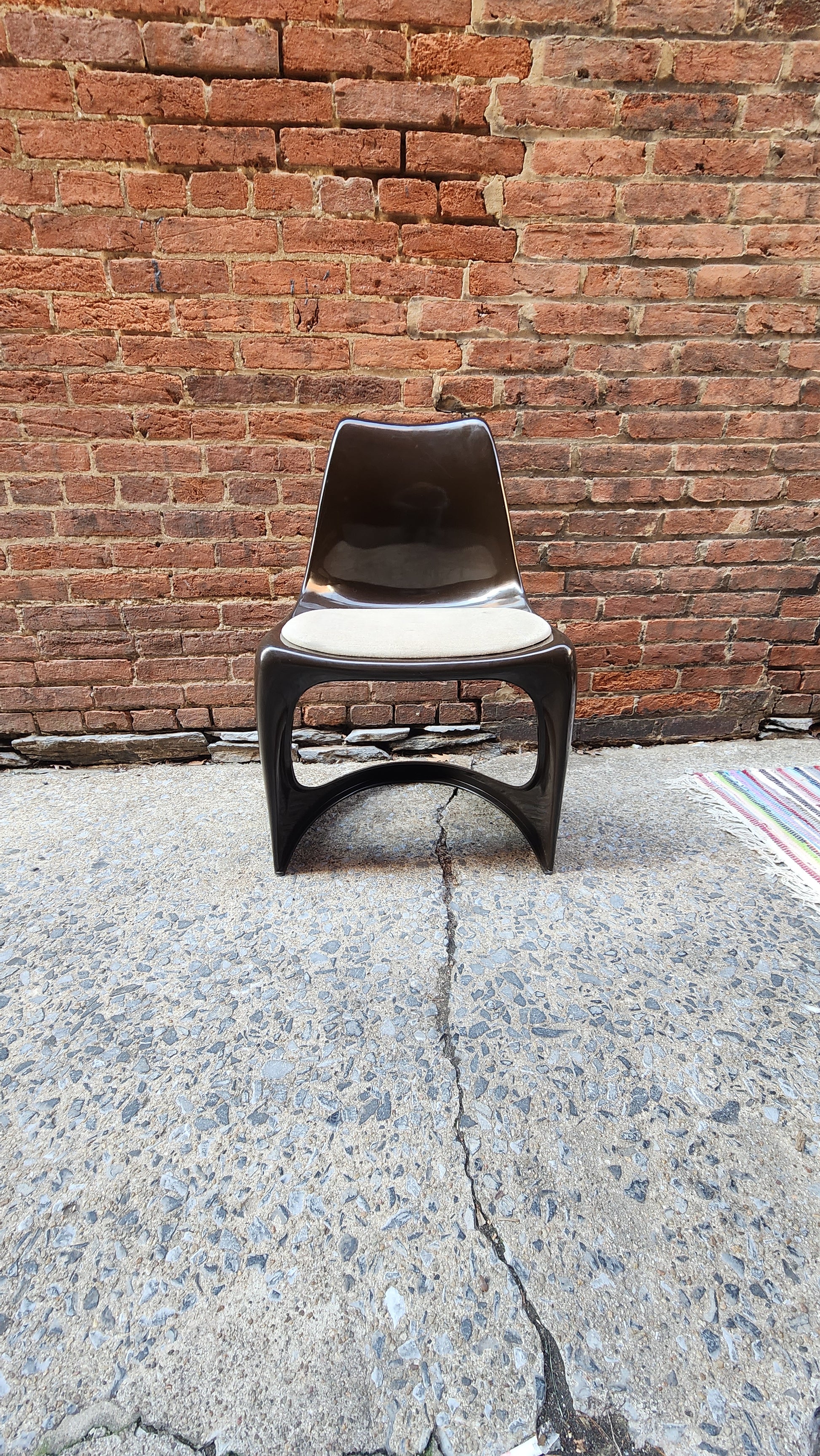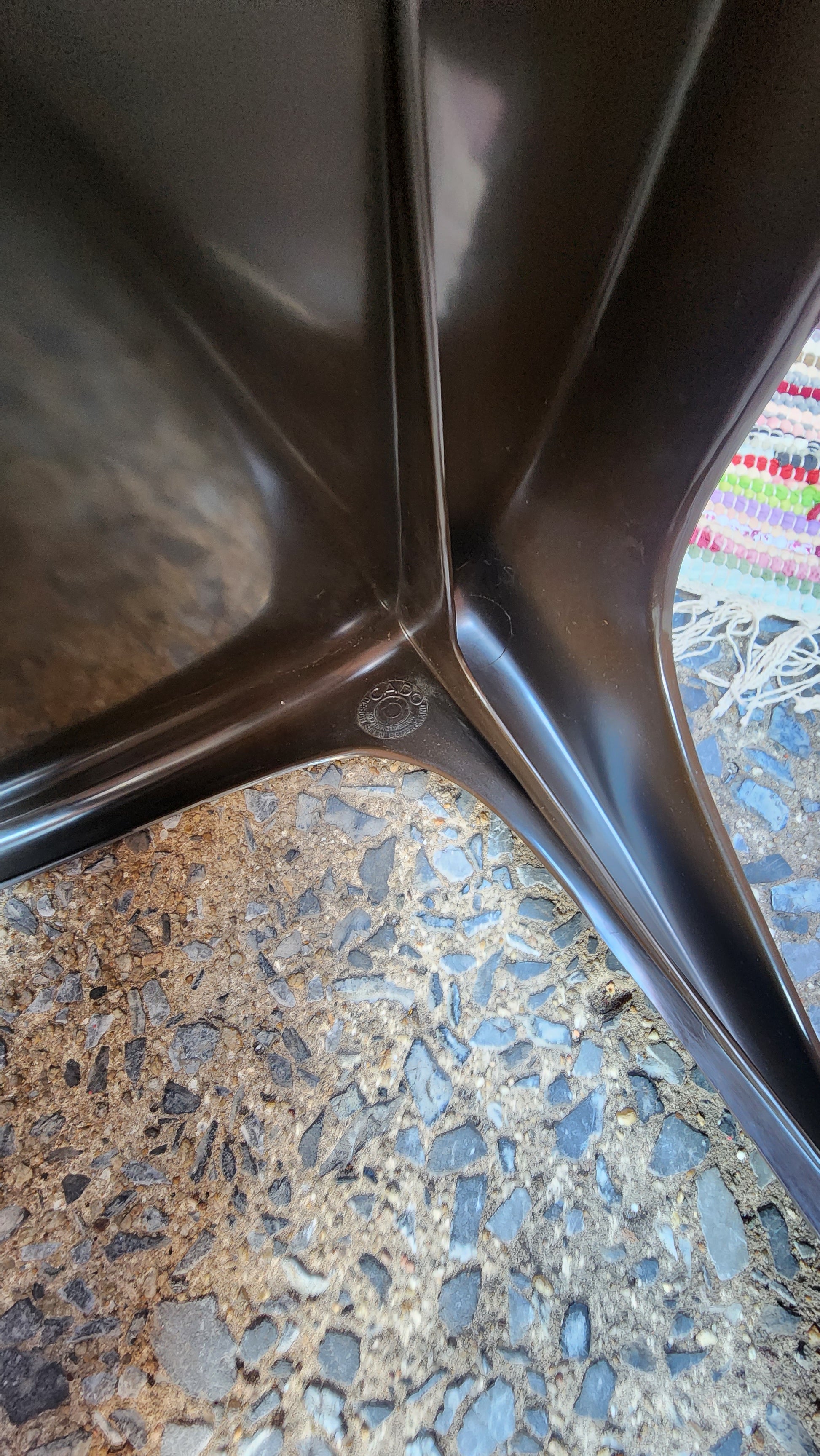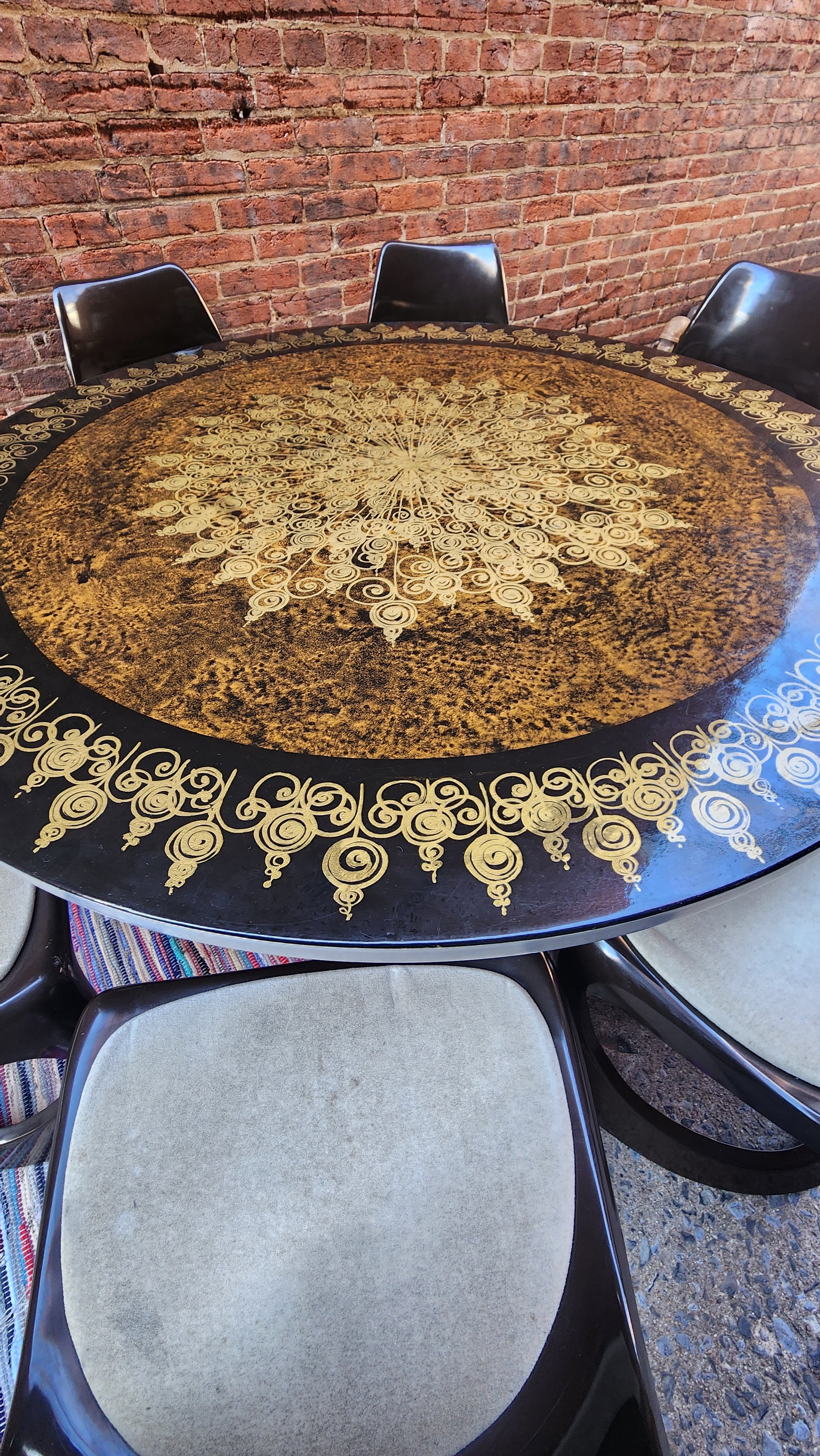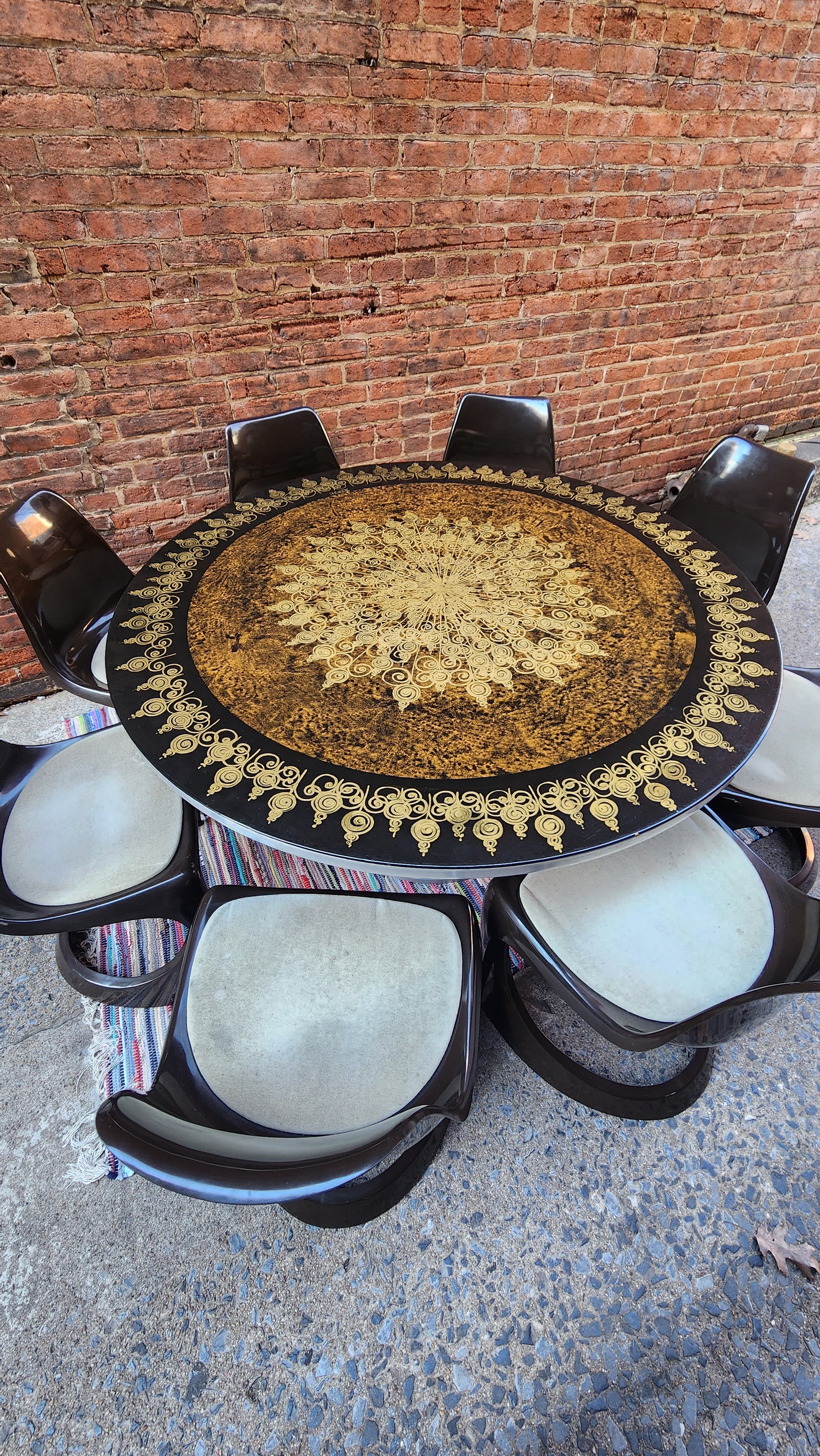 This incredible find includes a tulip base table and 8 chairs designed by iconic Danish designer, Poul Cadovius, creator of the original Cado wall unit. What makes this set even more amazing is it was purchased from the daughter of Cadovius and it was originally in his collection at his famed Cirkelhuset design center in Denmark.The table top art is by Susanne Fjeldsoe Myg, Danish artist and painter.