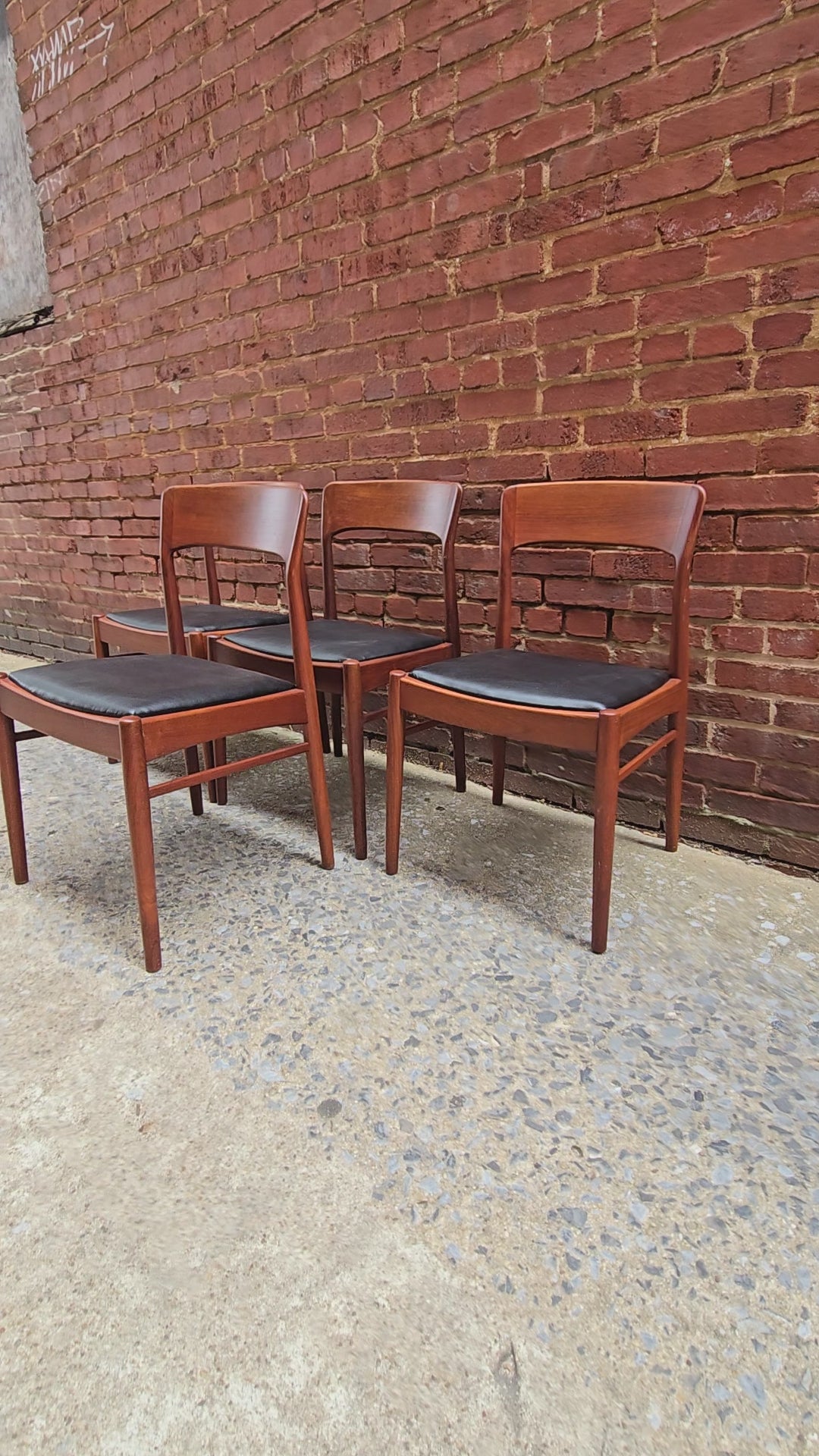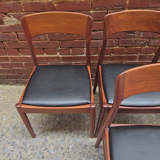Timeless, sculptural, and unmistakably Danish—this set of four teak dining chairs captures the refined elegance of classic Danish design. This iconic design by zhenry Kjærnulf is crafted from rich, warm teak with graceful curves and slender frames, each chair features a gently arched backrest and expertly contoured lines for both comfort and style. The seats are newly upholstered in a sleek black vinyl, offering a modern touch that complements the classic mid-century silhouette. A perfect blend of form and function, these chairs are ready to elevate any dining space with their understated sophistication.