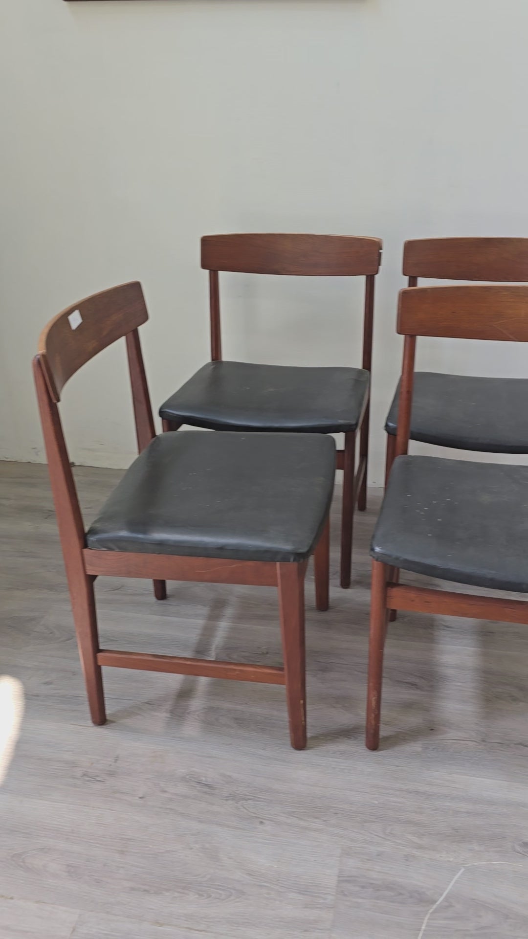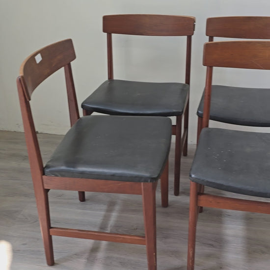 This set of four danish teak chairs were recently imported from denmark. Made in the 1950s, they are currently in original condition as seen in these photos. The price includes professional restoration including new black upholstery.