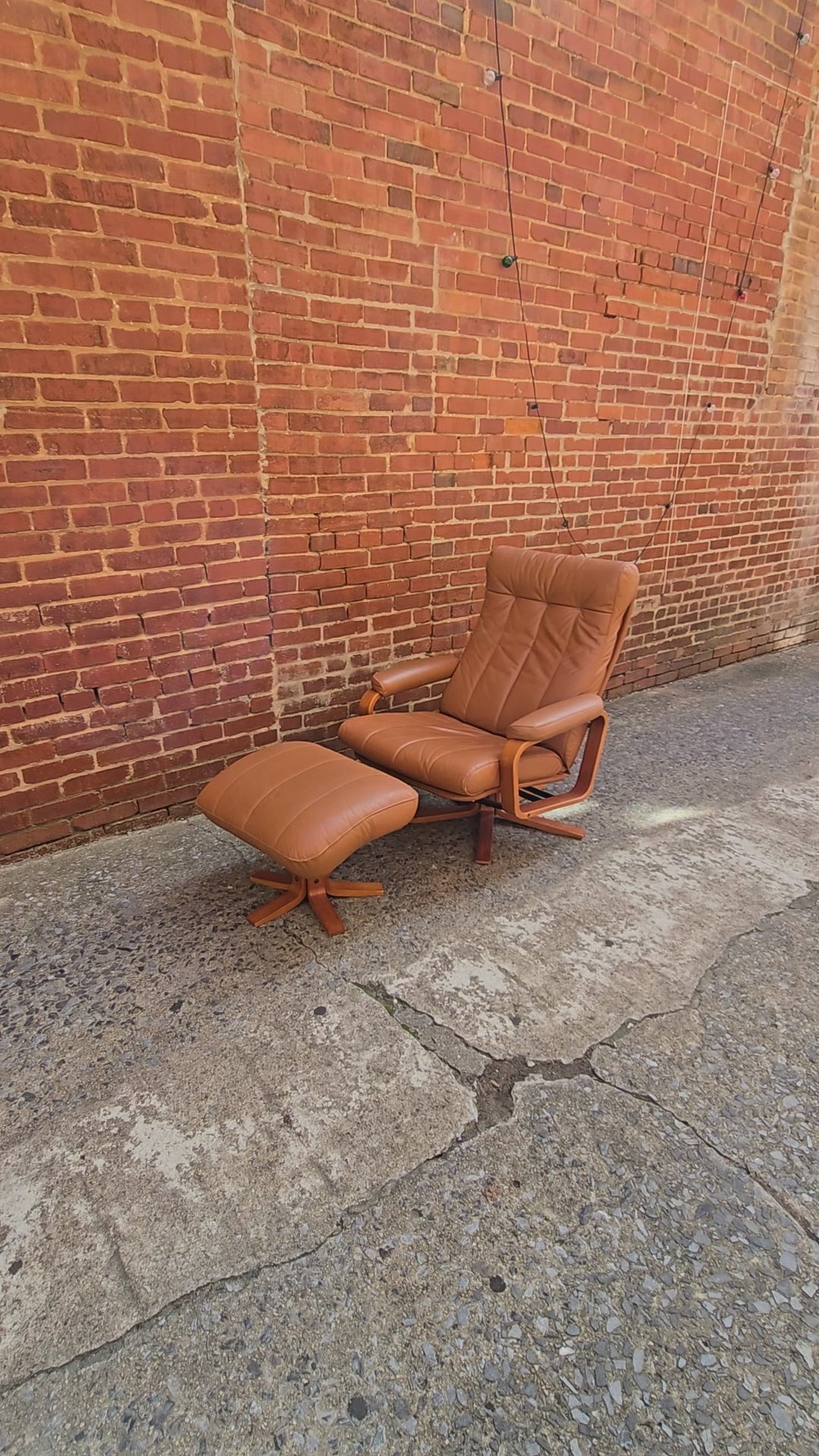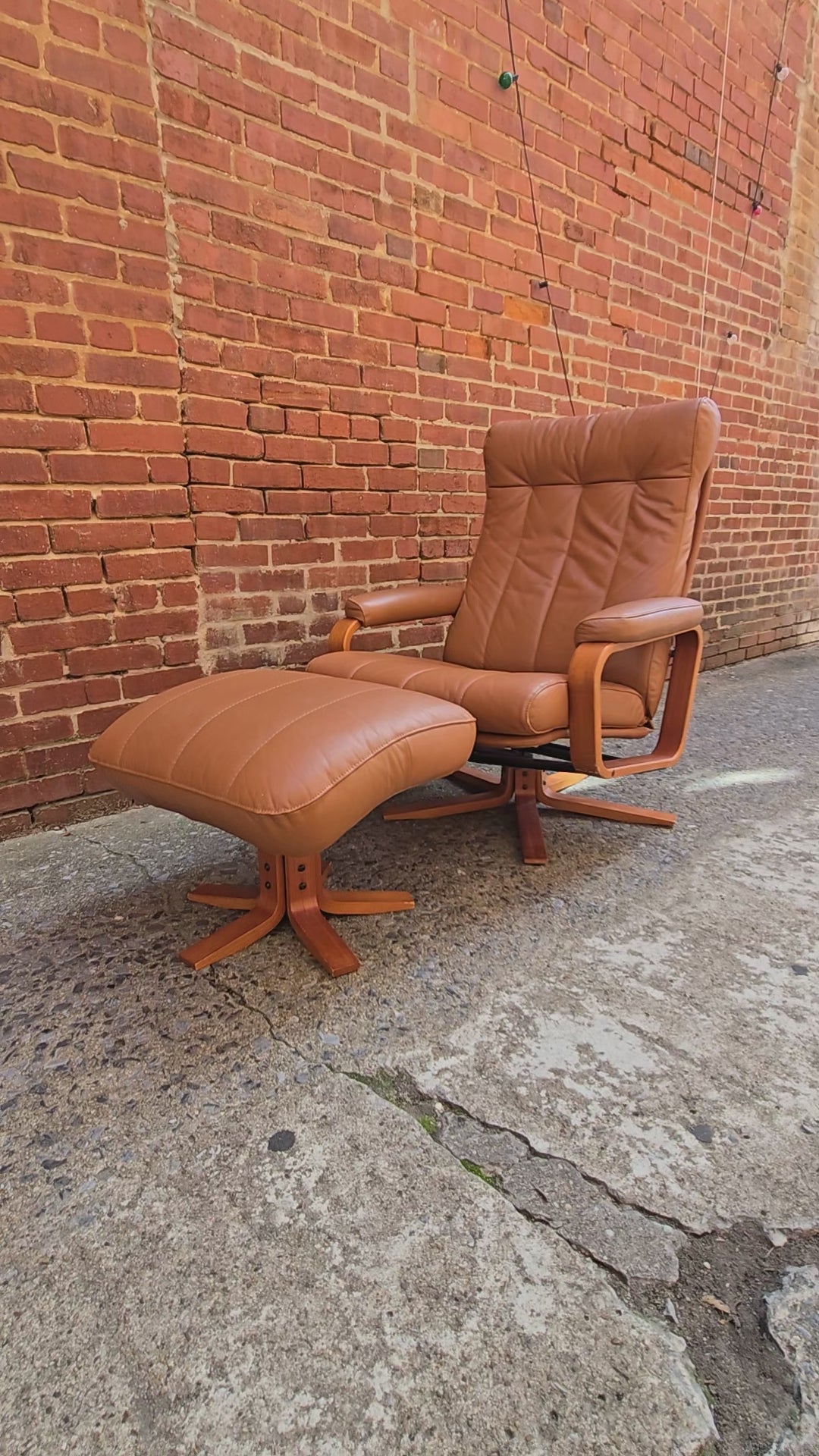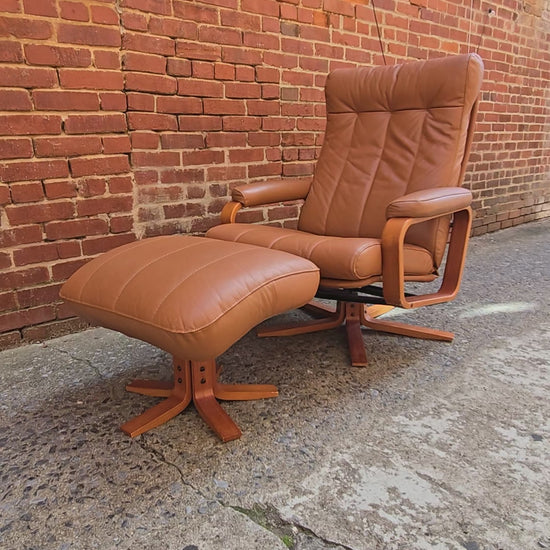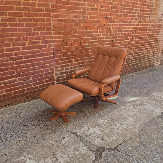 Relax in timeless Scandinavian style with this vintage Danish lounge chair and matching ottoman. Upholstered in supple caramel-toned leather, this set combines comfort with sleek mid-century design. The gently curved bentwood arms and sturdy swivel base highlight classic Danish craftsmanship, while the tufted backrest and plush cushions invite you to sink in and stay awhile.