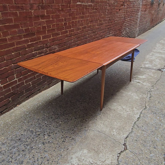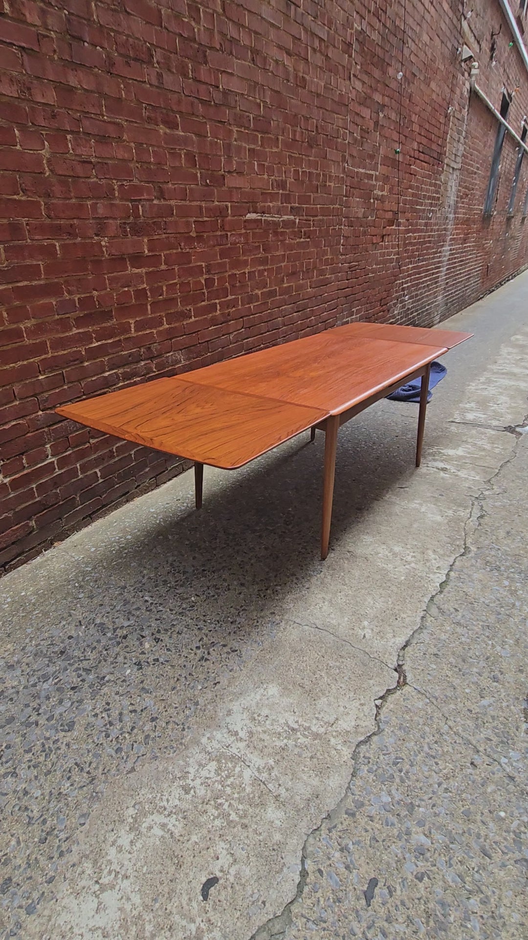 This incredible Danish teak dining table was designed by Svend Aage Madsen and is one of the most creatively engineered table we have seen. The mechanism to hide the leaves away is unusual and a signature of this renowned designer.