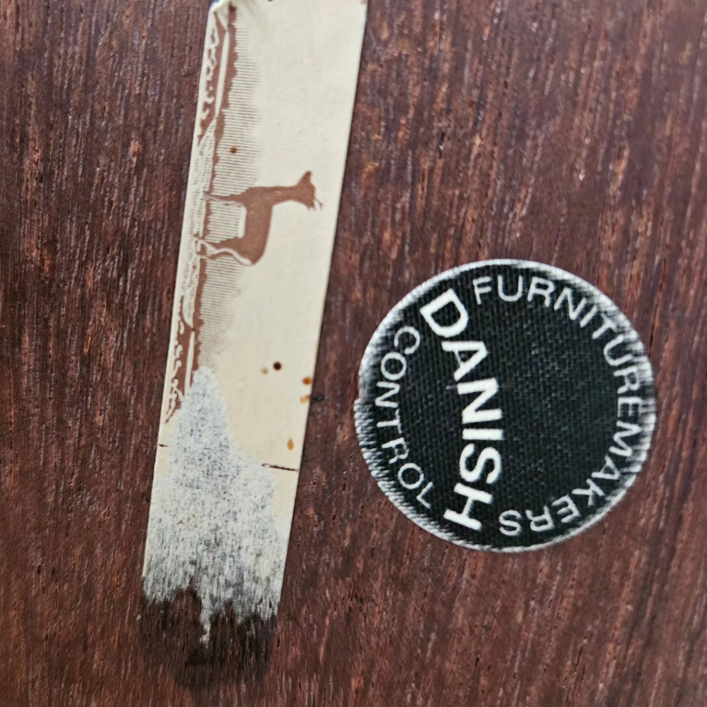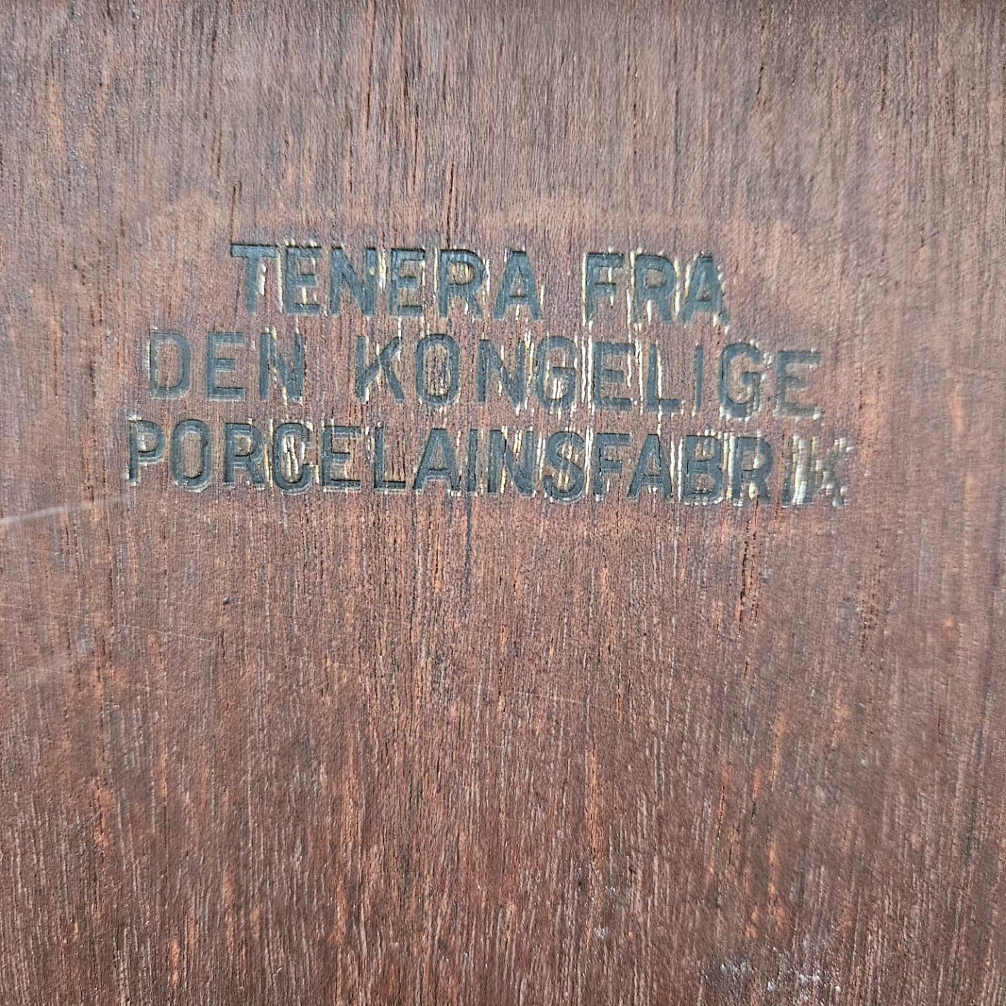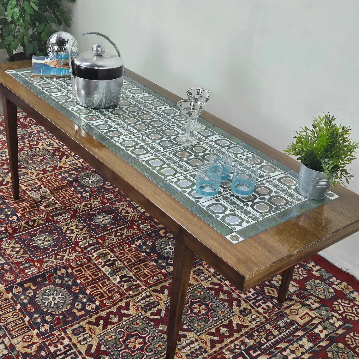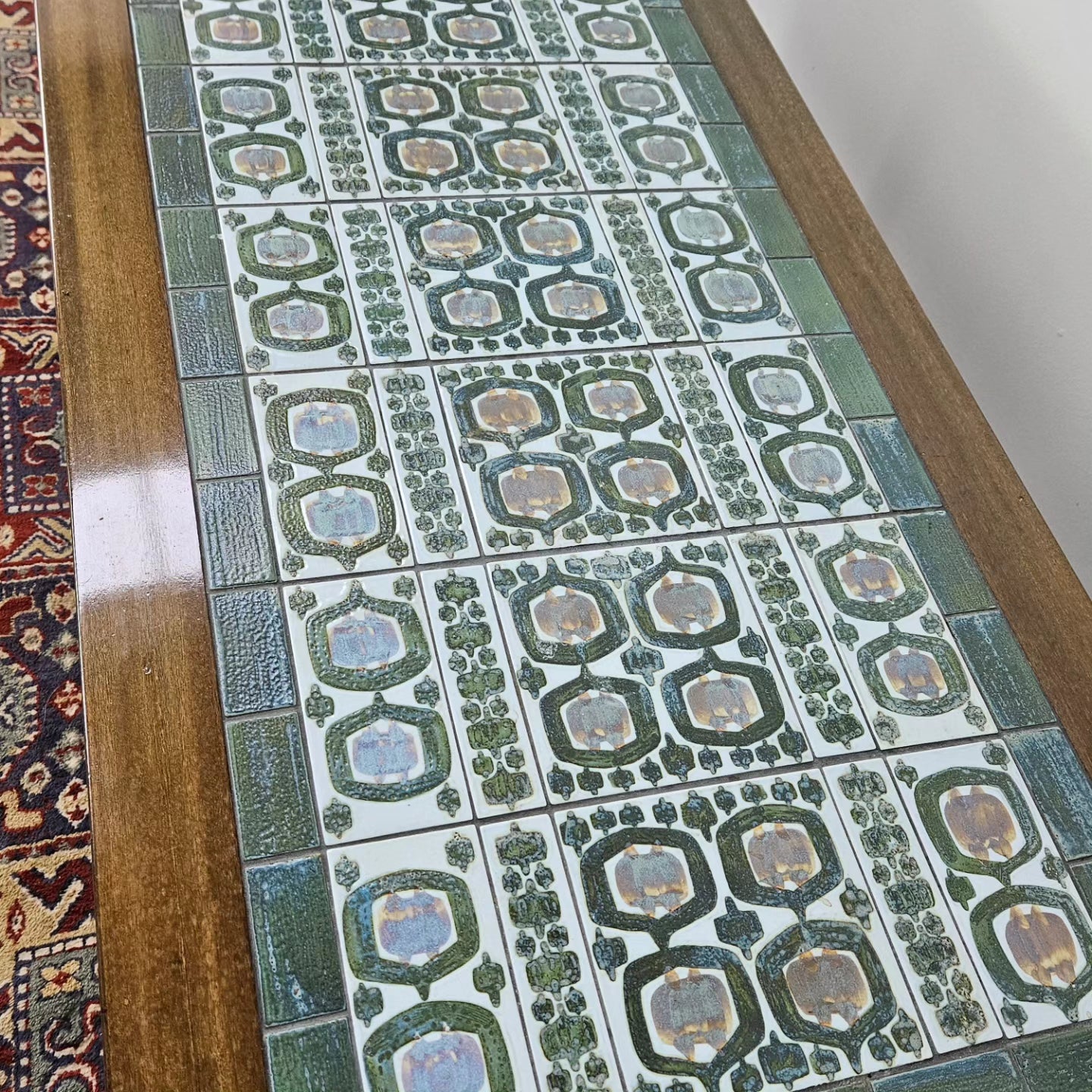 This rosewood Danish coffee table has Royal Copenhagen tiles inlaid in the top. Dimensions- 24" x 67" x 23" tall