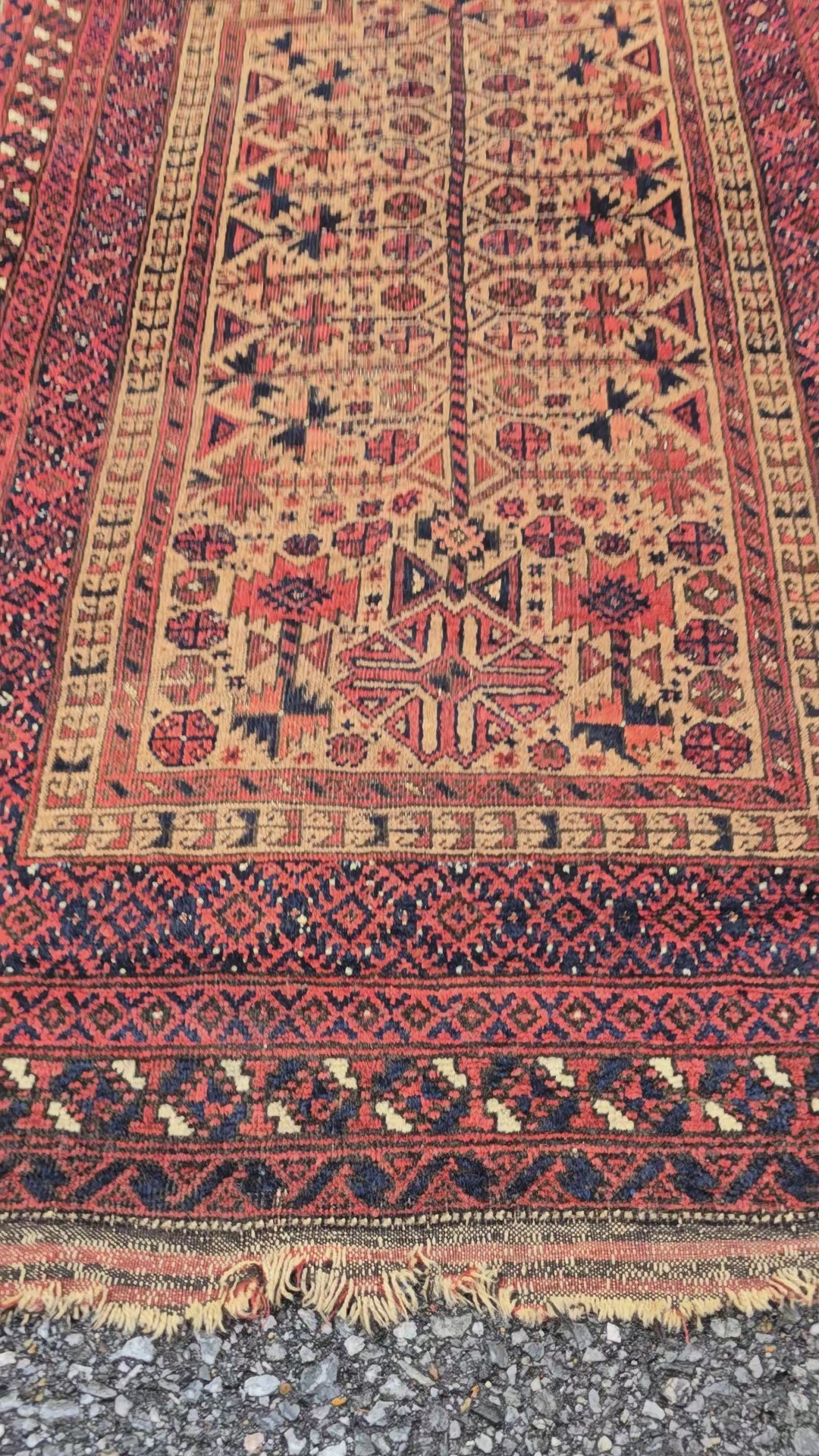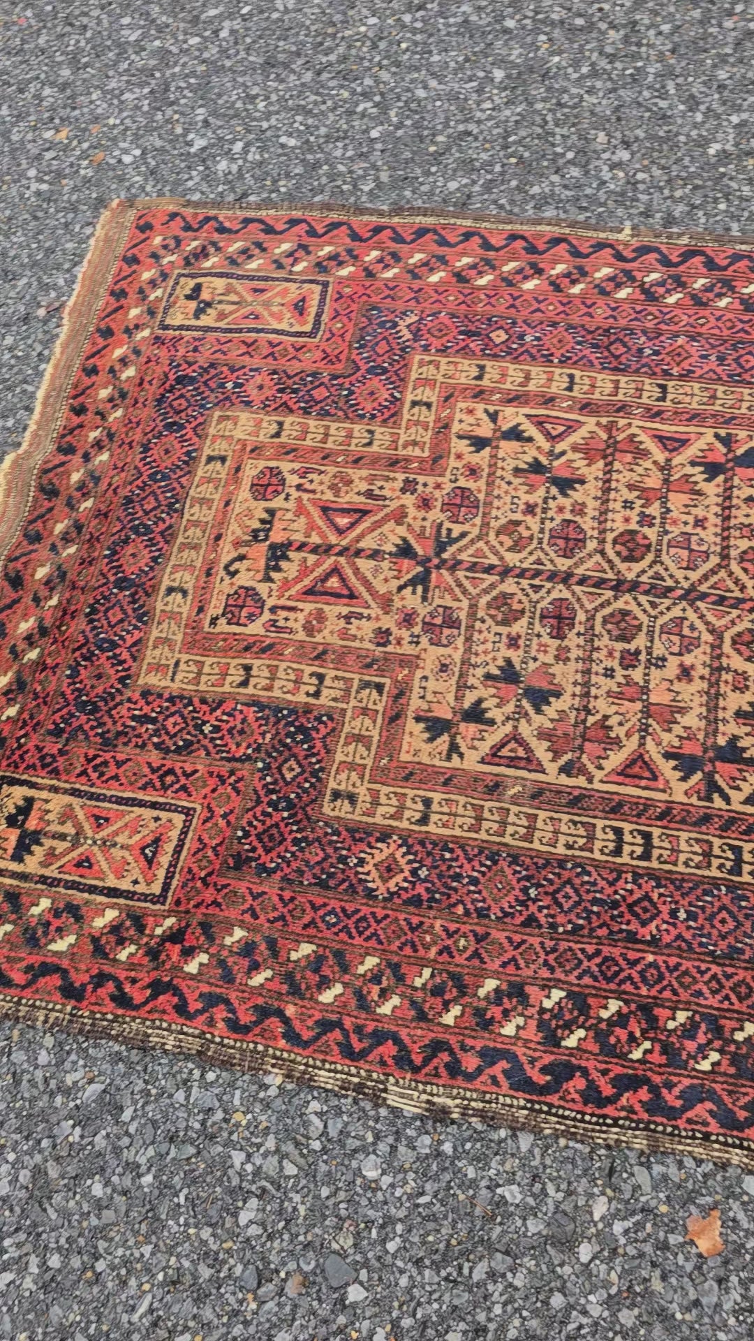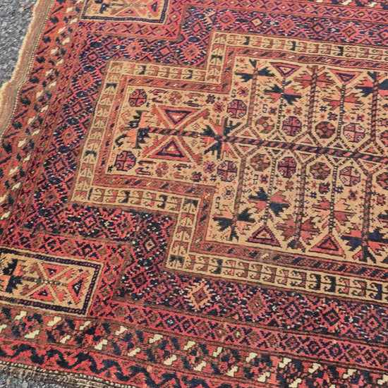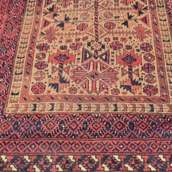 Bring history and handmade craftsmanship into your space with this authentic Afghan Baluch rug. Hand-knotted by skilled Baluchi weavers along the Afghanistan–Iran border, this piece showcases the region’s rich textile traditions with bold geometric motifs, symbolic medallions, and a beautifully layered border.