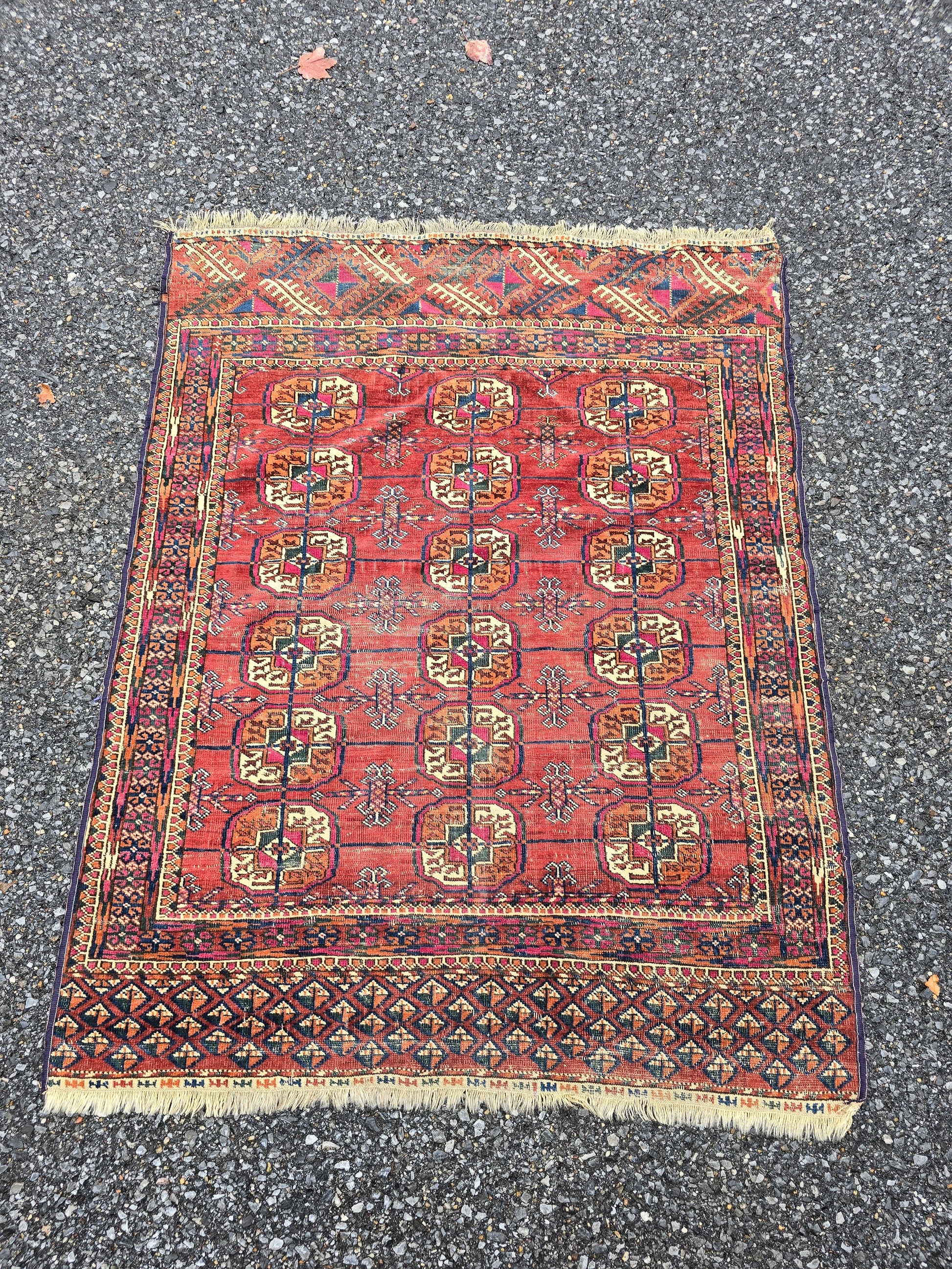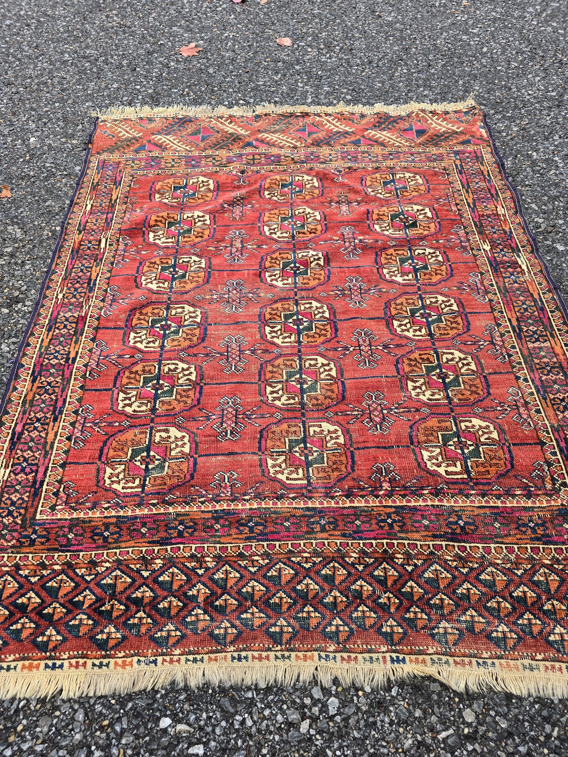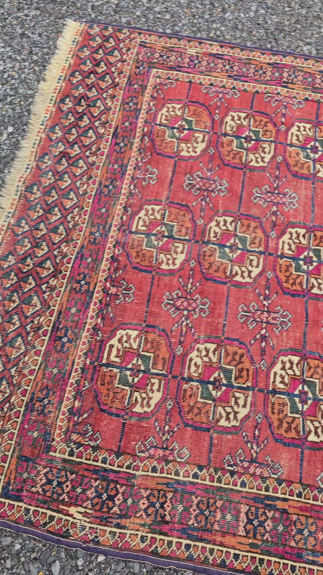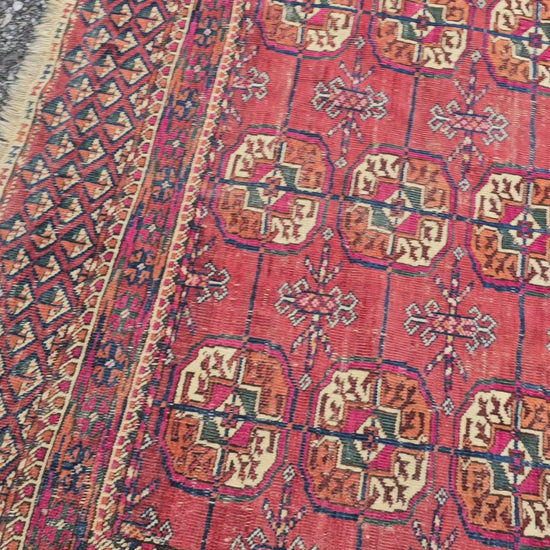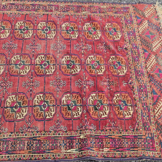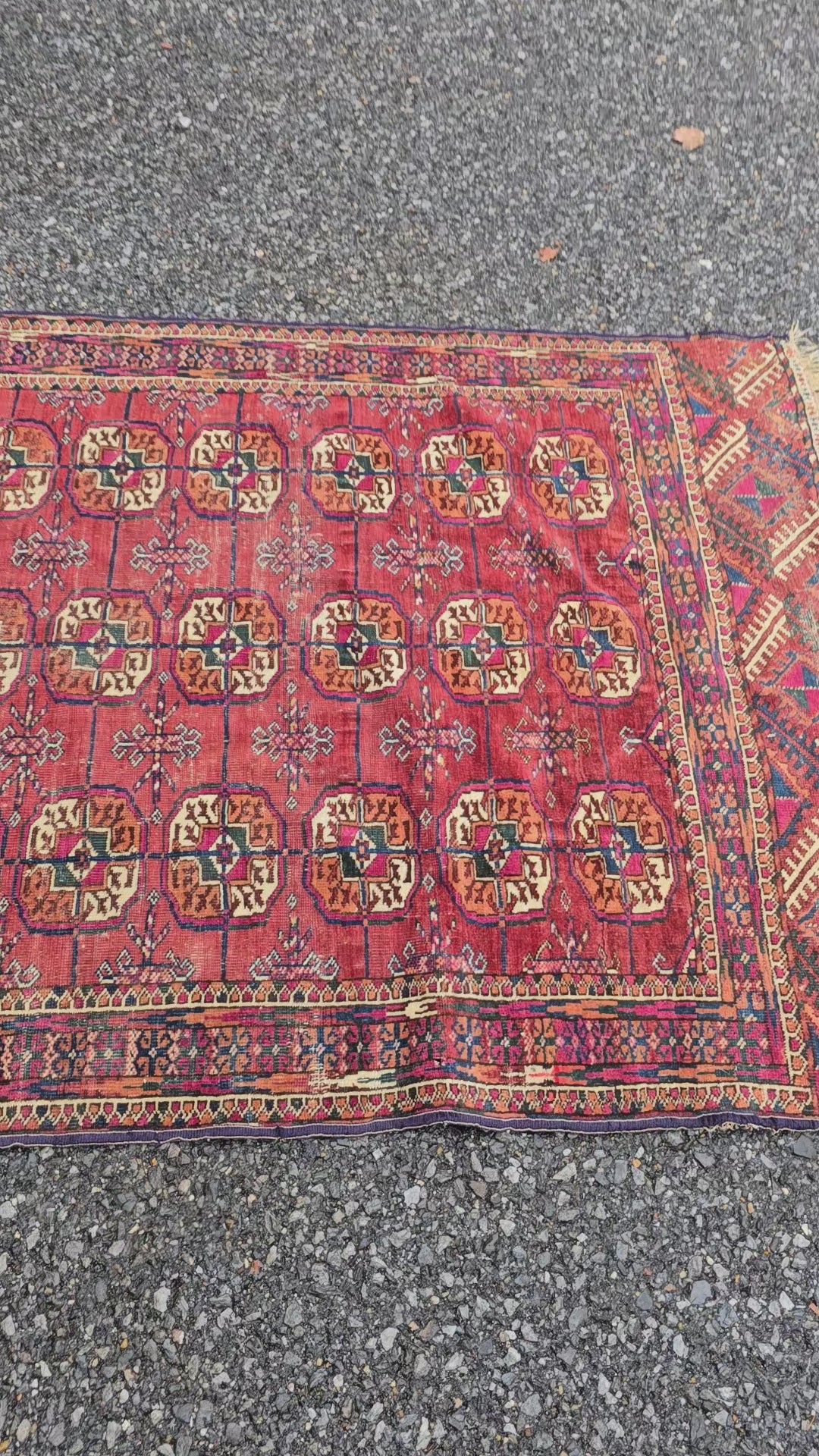 This beautiful flat weave Bokhara rug is likely from the early 1900s. It's in good vintage condition with typical signs of wear and one hole. See photos and video.